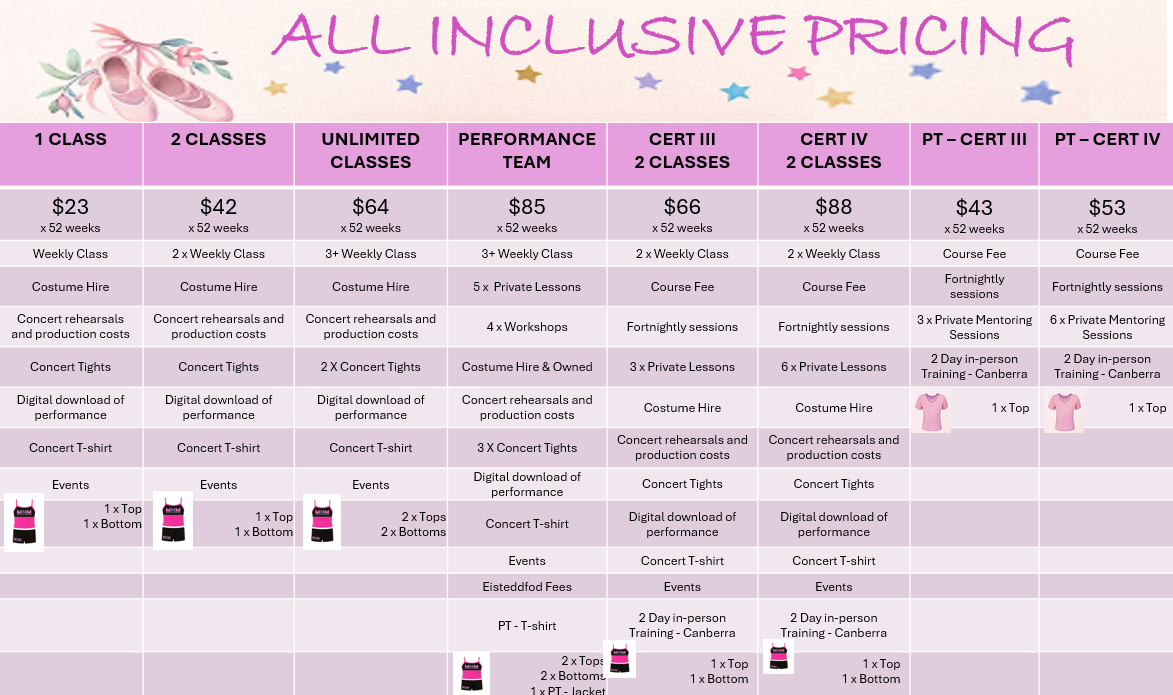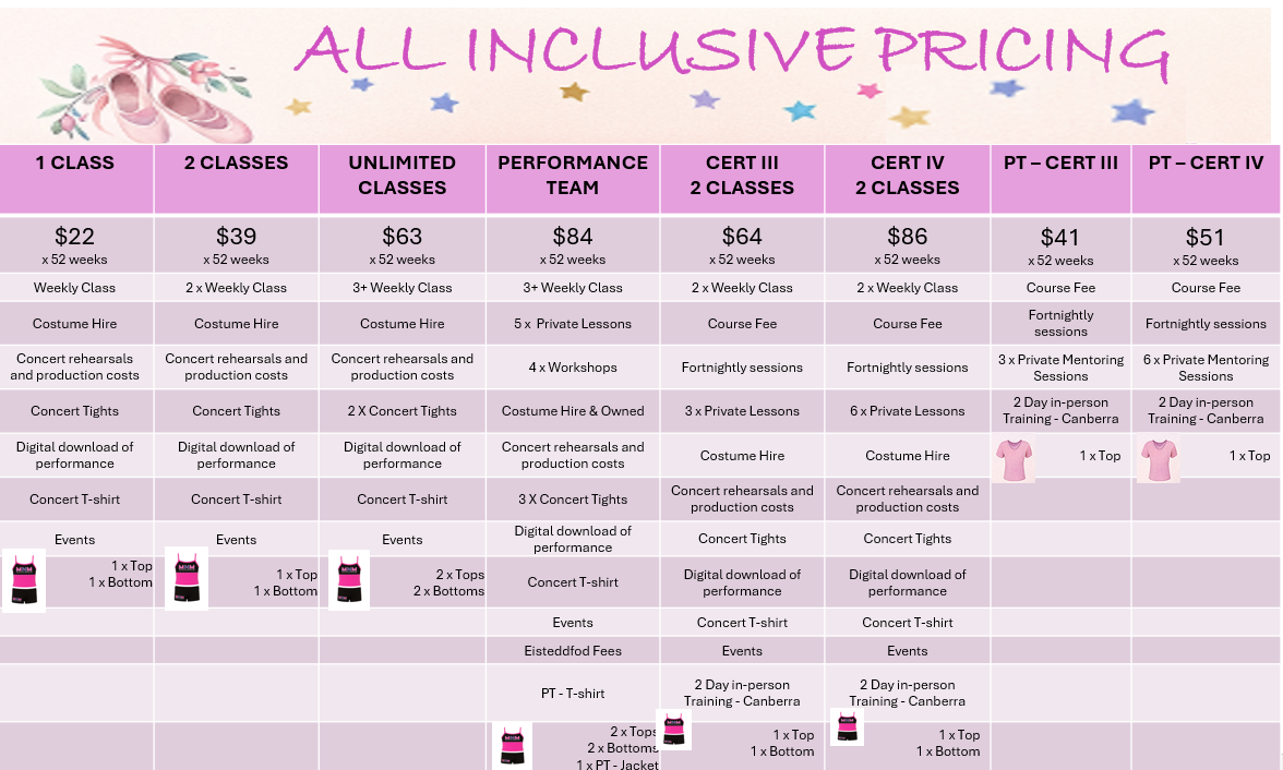 3+Weekly Classes, Costume Hire, Concert rehearsals and production costs, 2 x Concert Tights, Digital download of performance, Concert T-shirt, Events, Uniform 2 x Tops and 2 x Bottoms